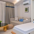 All room types come with a living area, open kitchen, bathroom, balcony, complimentary Wi-Fi, pillow menu, tea and coffee setup, and pool or garden views.