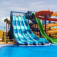 Aquapark: 16 slides, splash park, water playgrounds, and multi-lane racer slides (open April–October, weather dependent).