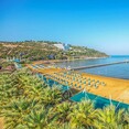 Aqua Fantasy Aquapark Hotel & Spa is located directly on Pamucak Beach, just outside Kusadasi in the Izmir Area. The hotel is surrounded by lush pine forests and is only 6 km from the ancient city of Ephesus and 8 km from Kusadasi town center. Izmir Adnan Menderes Airport is approximately 55 km away, ensuring convenient access for international travelers. The resort’s prime seafront setting provides guests with direct beach access and stunning views of the Aegean Sea.