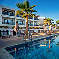 Contemporary open-plan rooms with twin or double beds, modern furnishings, private balcony, air conditioning, flat-screen TV, mini-fridge, and bathroom with walk-in shower.Studio with Private Pool