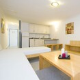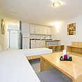 Kitchenette with fridge, microwave, kettle, and basic utensils