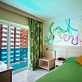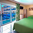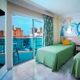All rooms at Hotel Servigroup CalypsoBenidorm, Costa Blanca are designed for comfort and convenience, featuring pastel décor, private terraces, and modern amenities.
