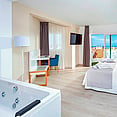 Suite: Spacious accommodation with two double beds, sofa bed, two Smart TVs, hydromassage bath, air conditioning, and a large terrace or balcony. Family suites are also available, offering extra amenities for children.